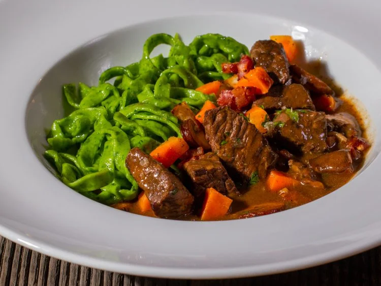 This stew pairs well with my spätzli, roasted garlic mashed potatoes, or in this photo, a hint of winter giving way to spring with wild garlic tagliatelle.