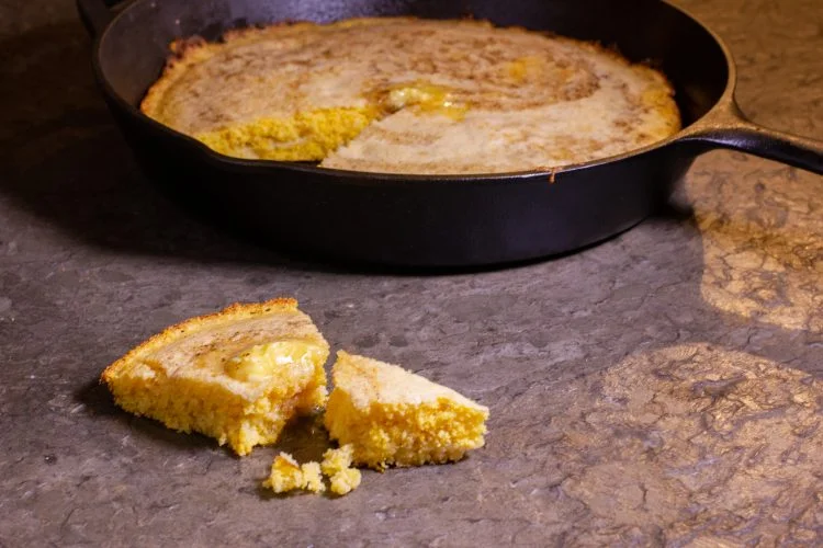 I was first taught a skillet cornbread recipe from the late Chef John at A Chef’s Kitchen in Williamsburg, Virginia. My version adds some flour (which outs me as a Northerner), and a lower baking temperature as I’m normally using the oven for other dinner ingredients. This recipe is for a 10 in/25 cm pan.