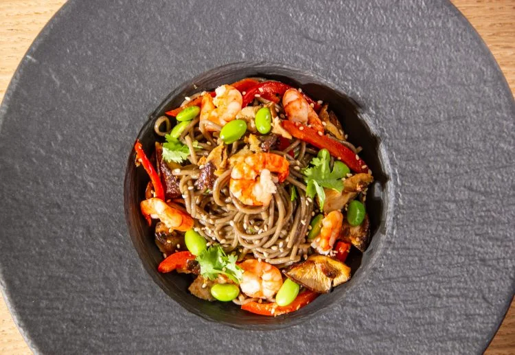 - Mix ingredients together. To the veg, add the noodles, shrimp, sauce, lime juice and zest, sesame oil, and edamame.