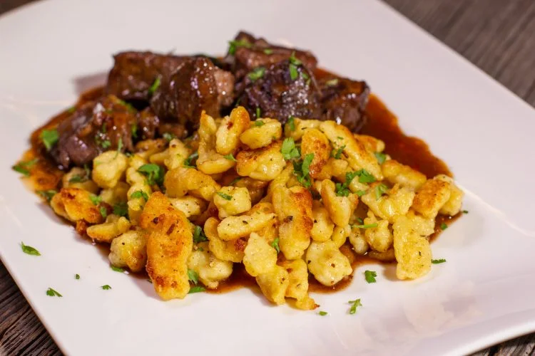 This side dish meaning “little sparrows” in the German Swabian dialect makes a great partner to a winter stew or roasted joint of meat. The 2-step cooking method of a short boil, then a sauté, keeps them fluffy inside and slightly caramelized on the outside.